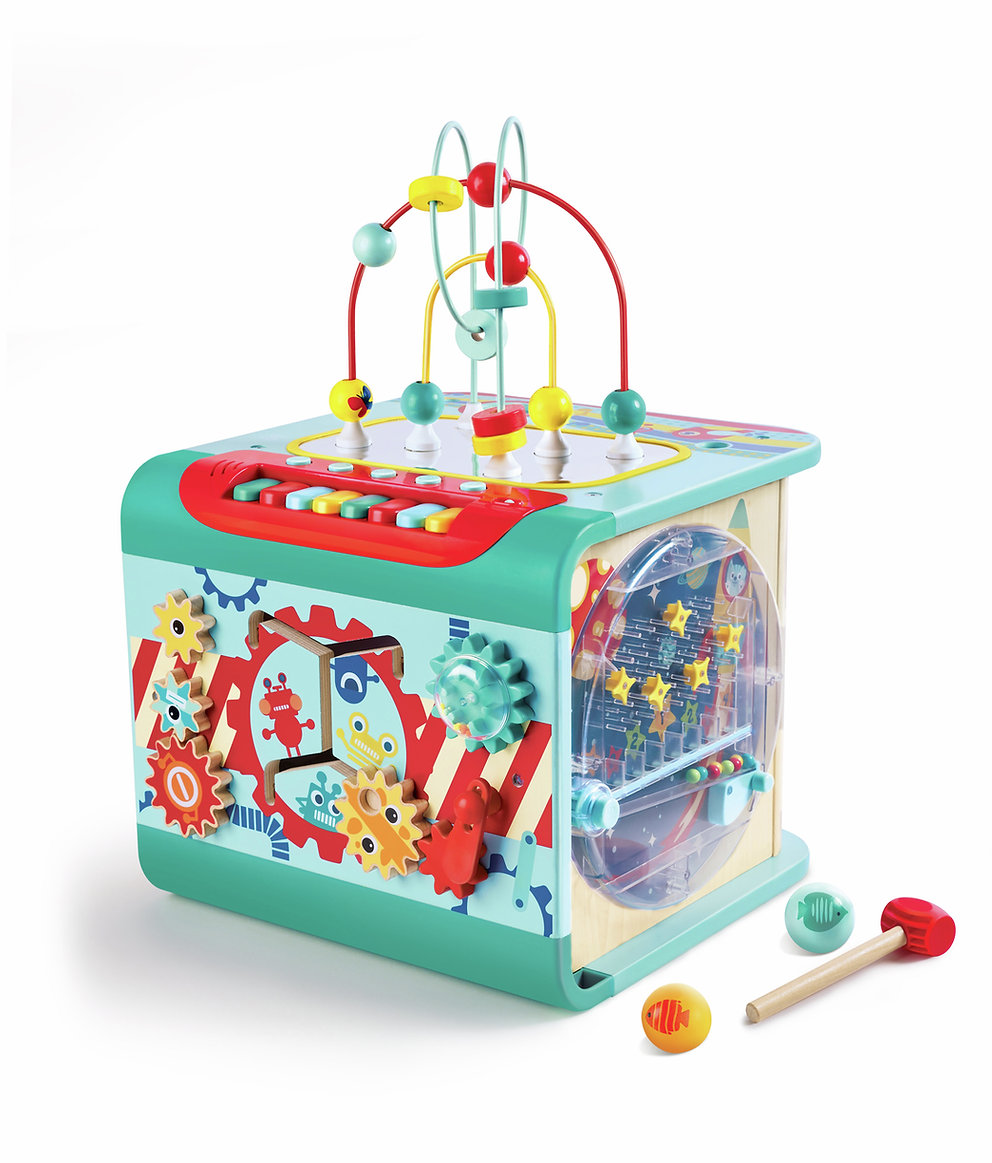 - Comprend des engrenages qui tournent, un jeu d’association de formes, un jeu de balle et un flipper